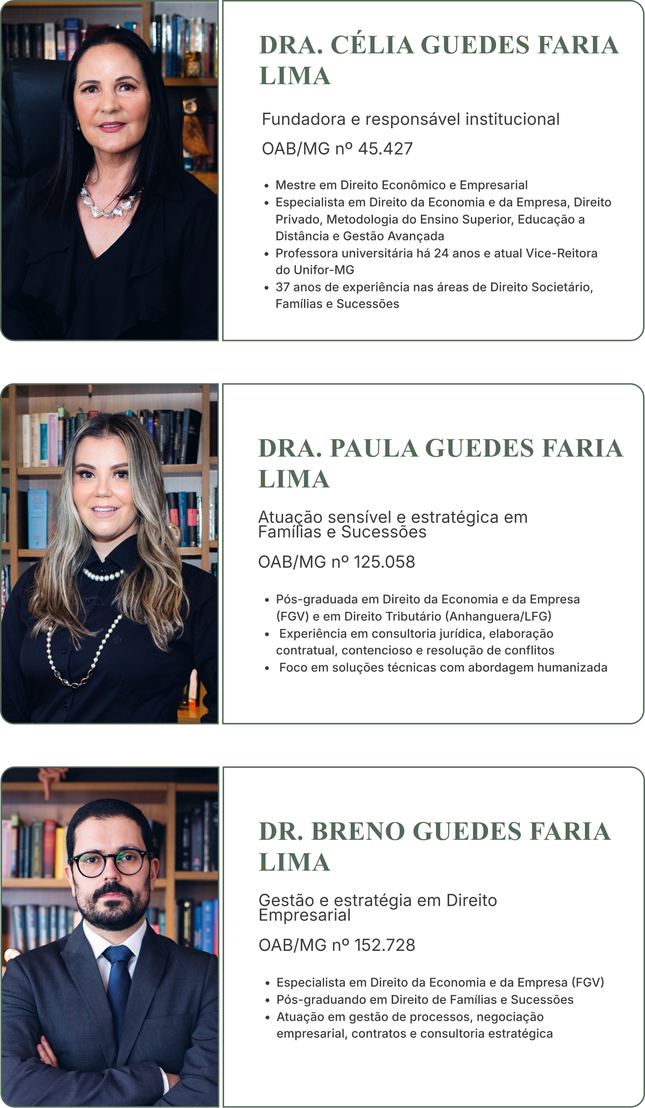 O escritório é conduzido por profissionais que unem formação acadêmica sólida, experiência prática e valores éticos.